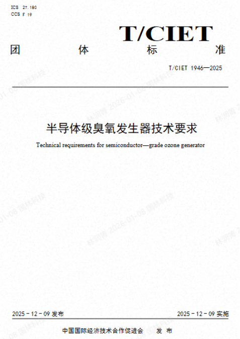 2025年12月9日,由國(guó)林半導(dǎo)體主持編制的國(guó)內(nèi)半導(dǎo)體行業(yè)首個(gè)《半導(dǎo)體級(jí)臭氧發(fā)生器技術(shù)要求》團(tuán)體標(biāo)準(zhǔn)(T/CIET 1946-2025)正式發(fā)布實(shí)施。